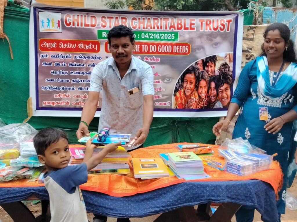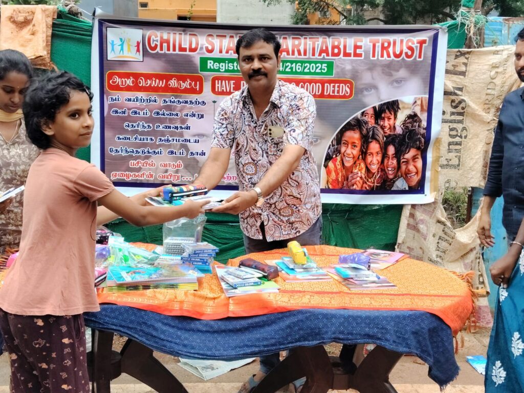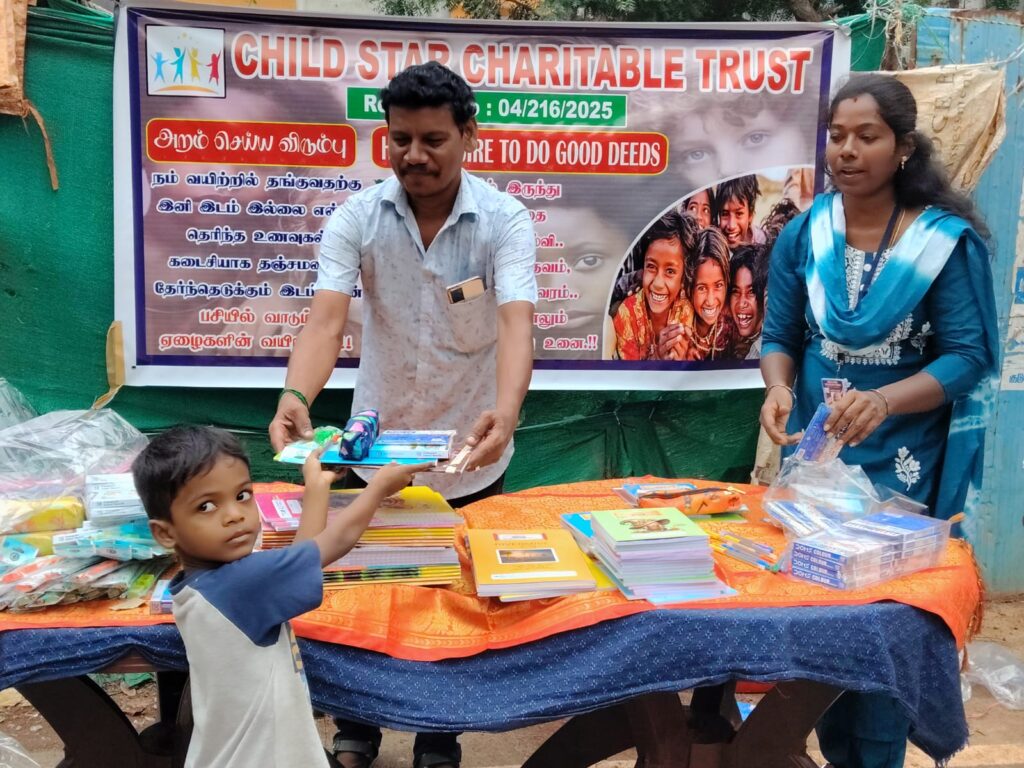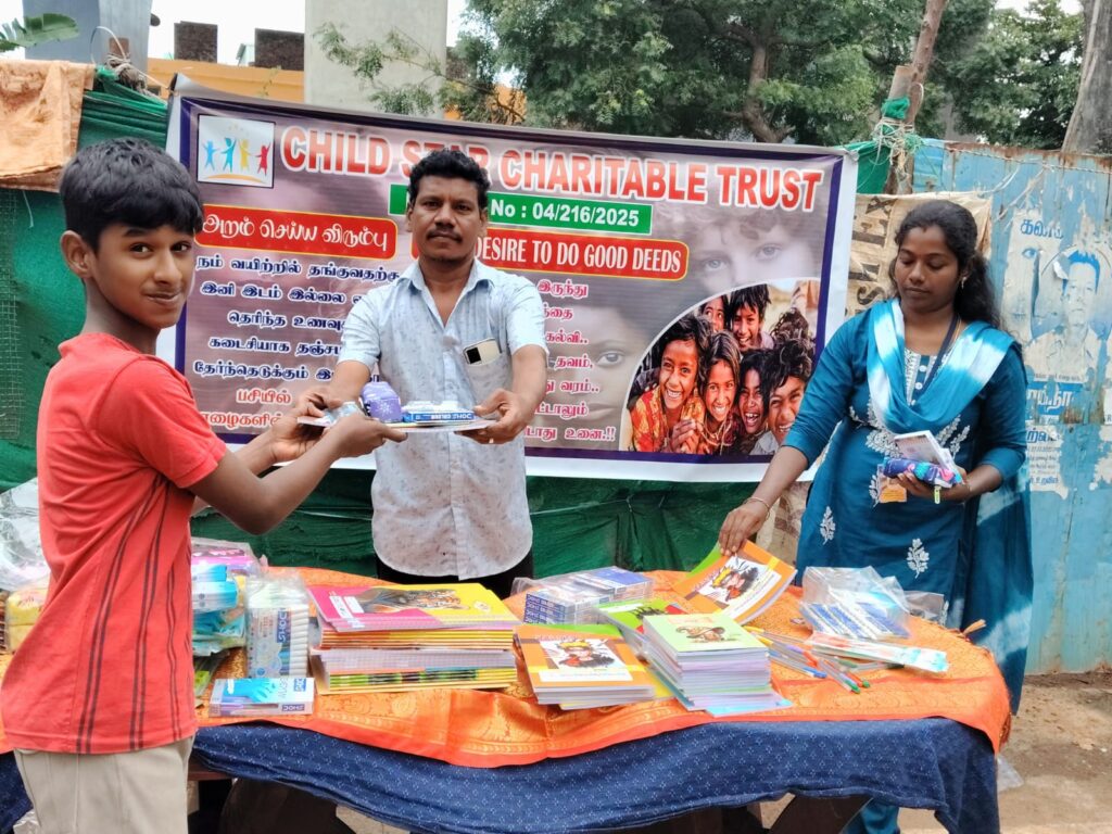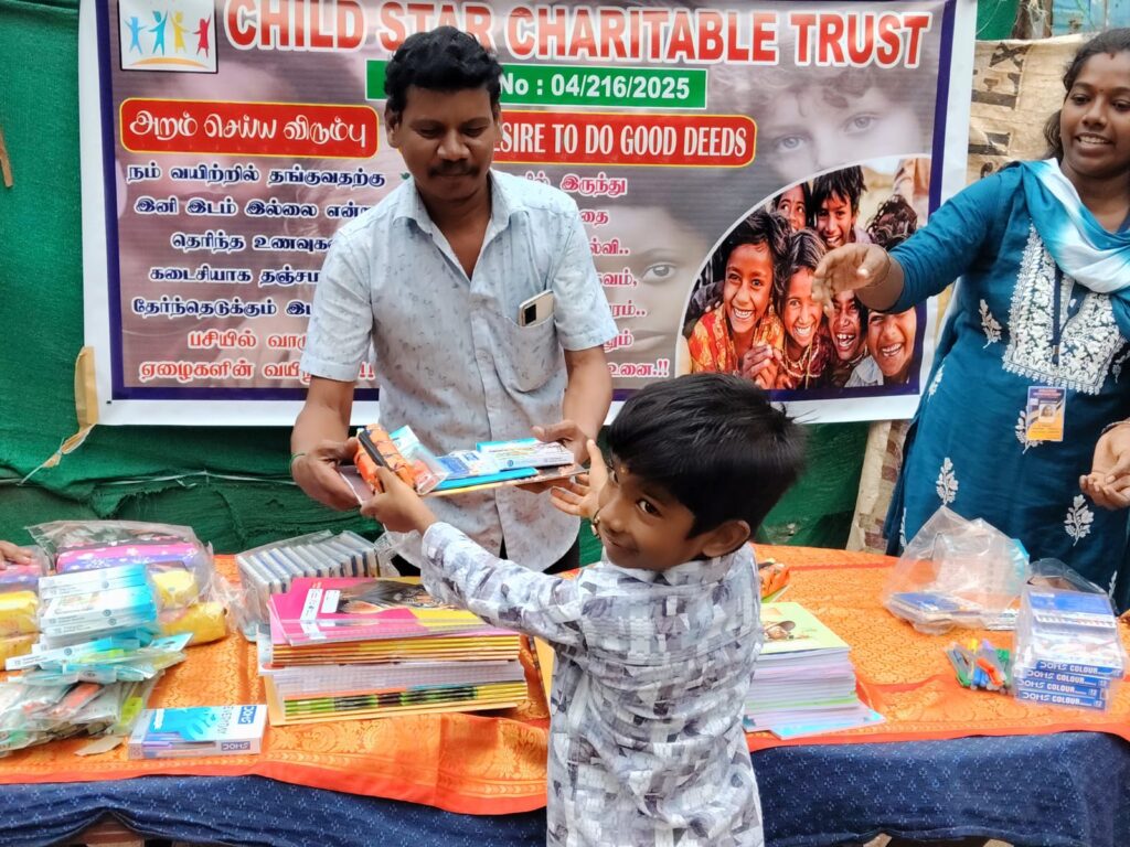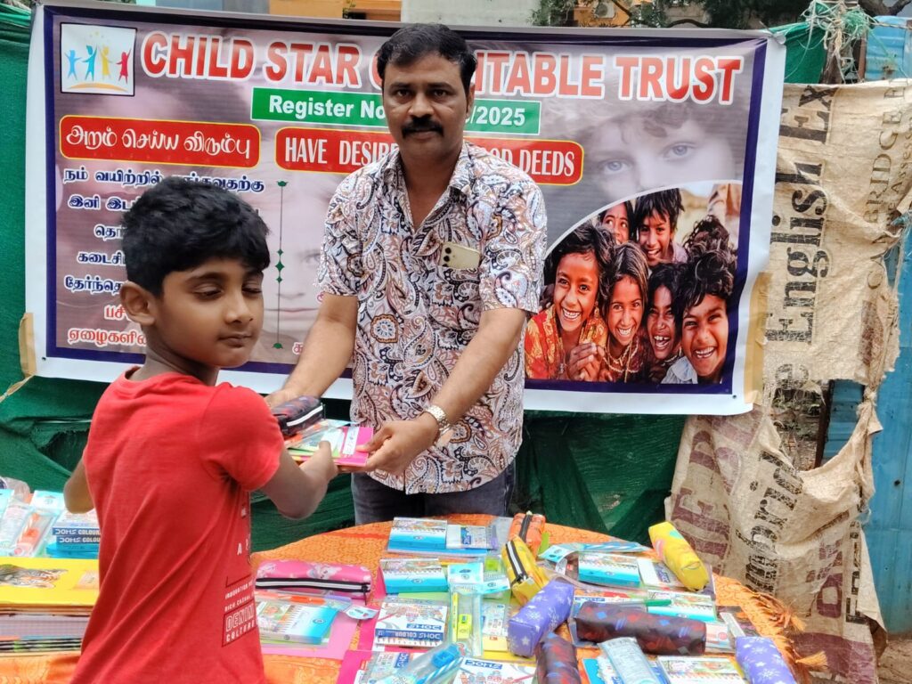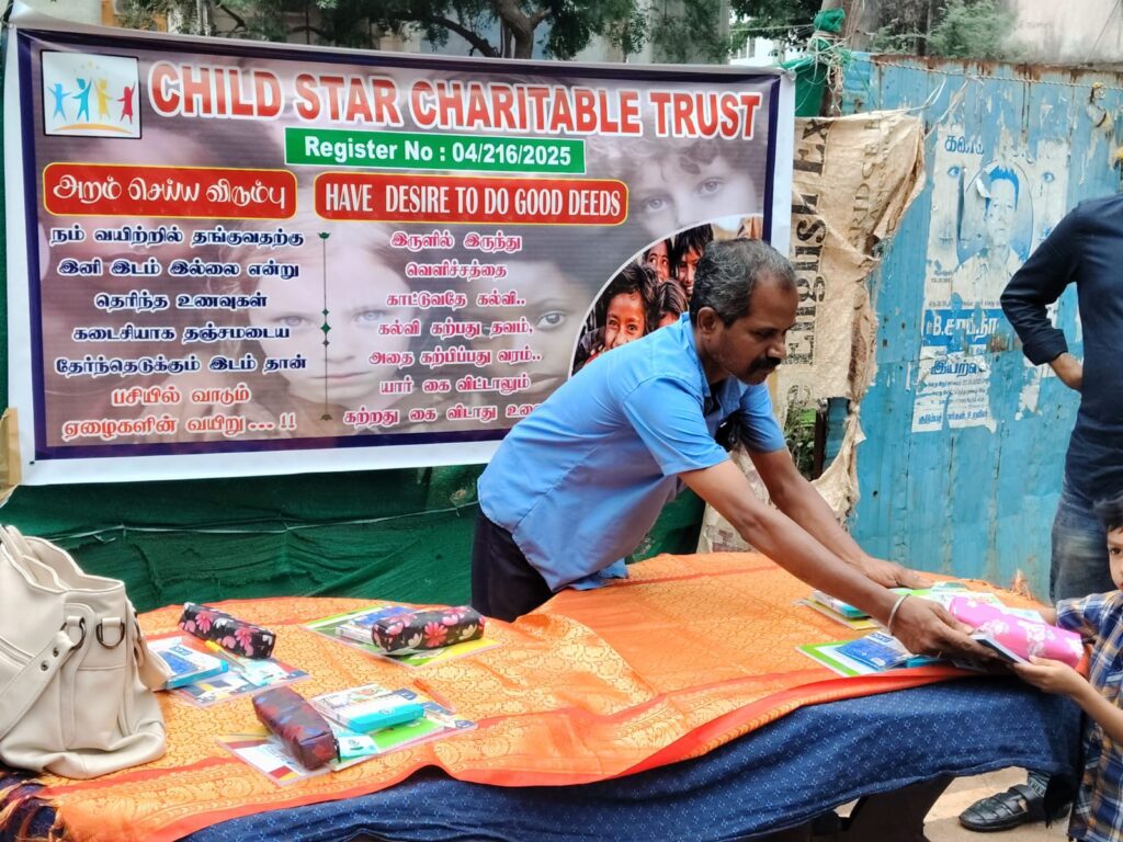 On November 23, 2025, Child Star Charitable Trust organized a street outreach event in Chennai, distributing essential stationery kits (books, notebooks, pens, and school supplies) to 100 underprivileged children and families.