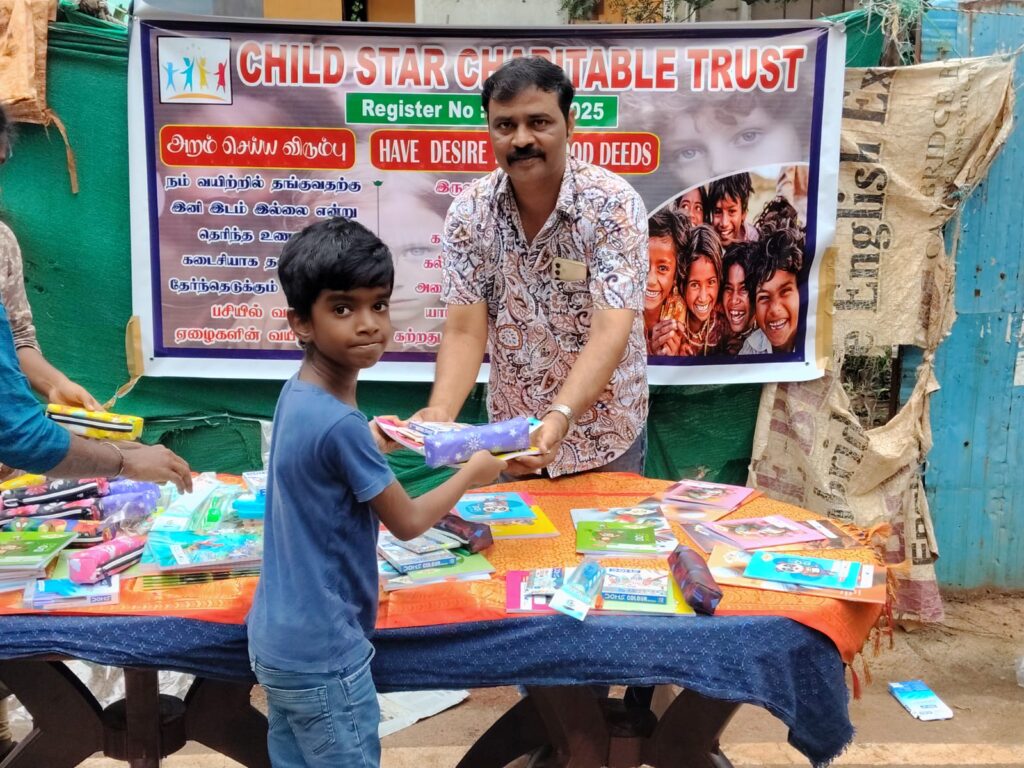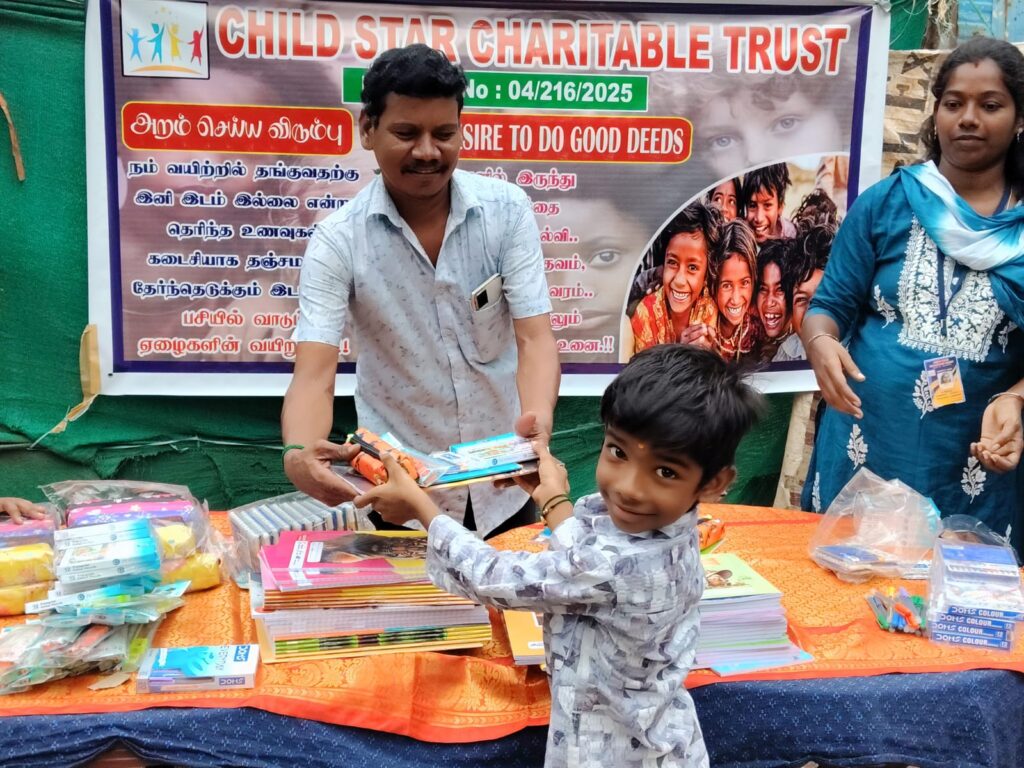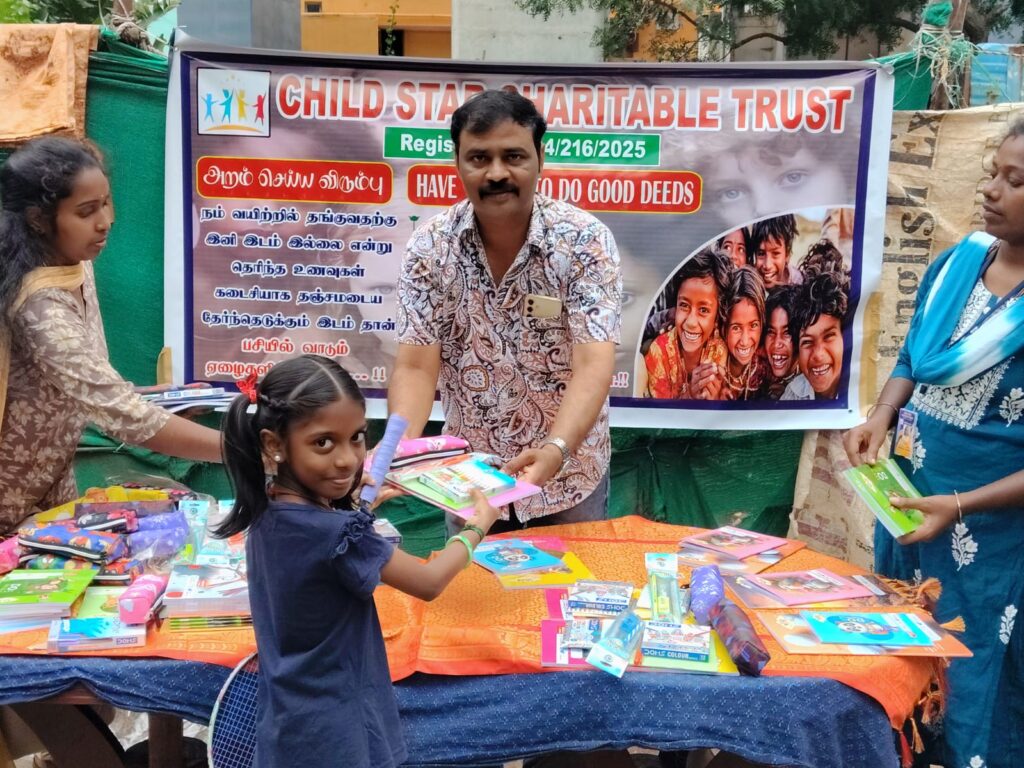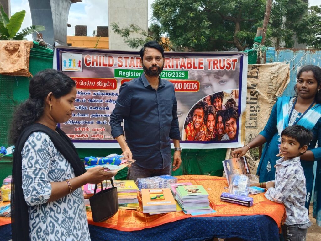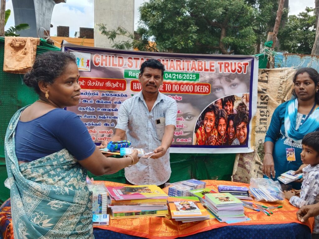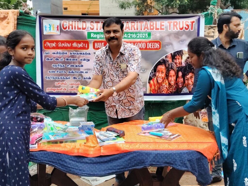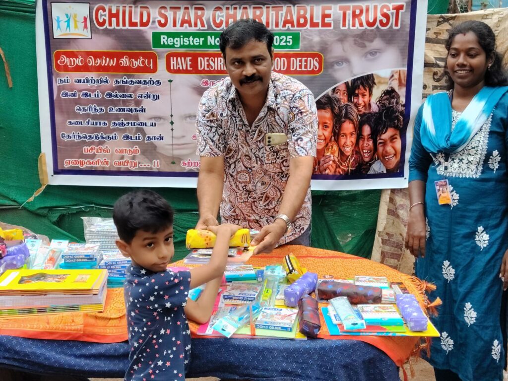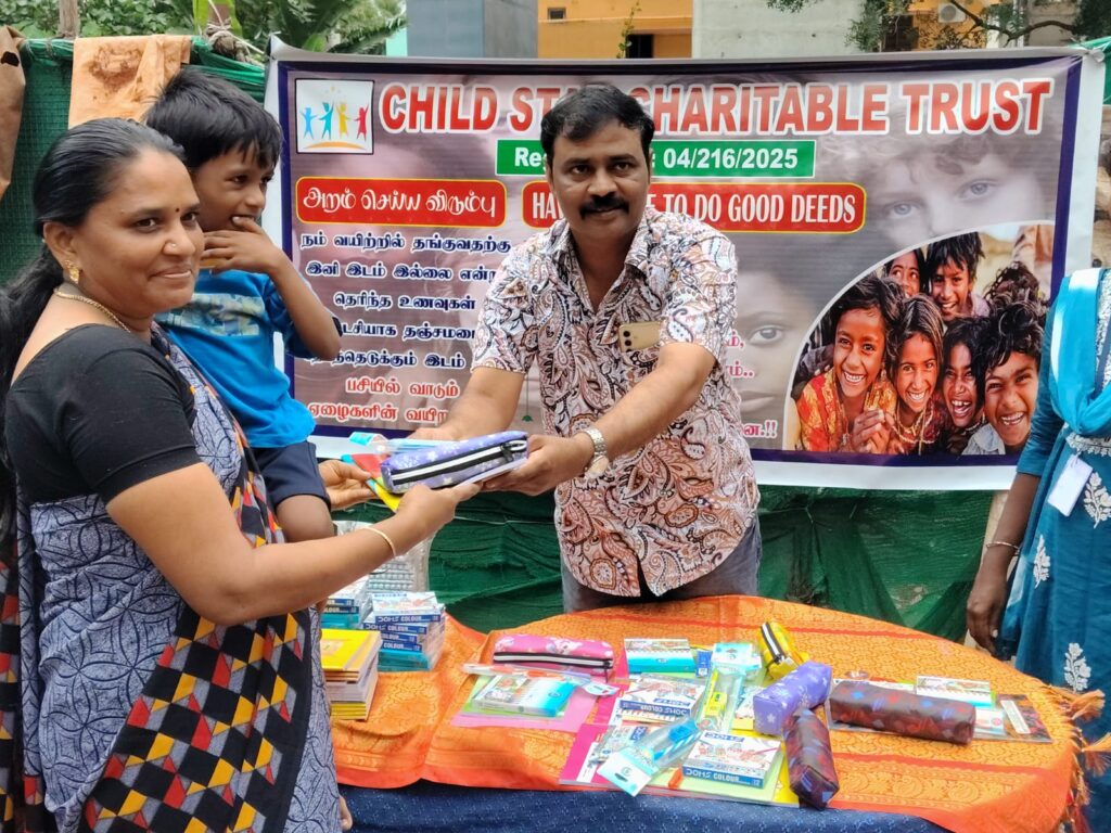 On November 23, 2025, Child Star Charitable Trust organized a street outreach event in Chennai, distributing essential stationery kits (books, notebooks, pens, and school supplies) to 100 underprivileged children and families.