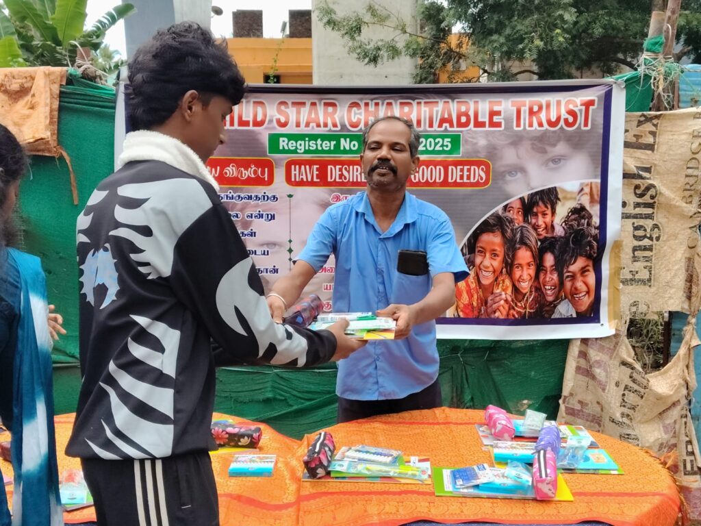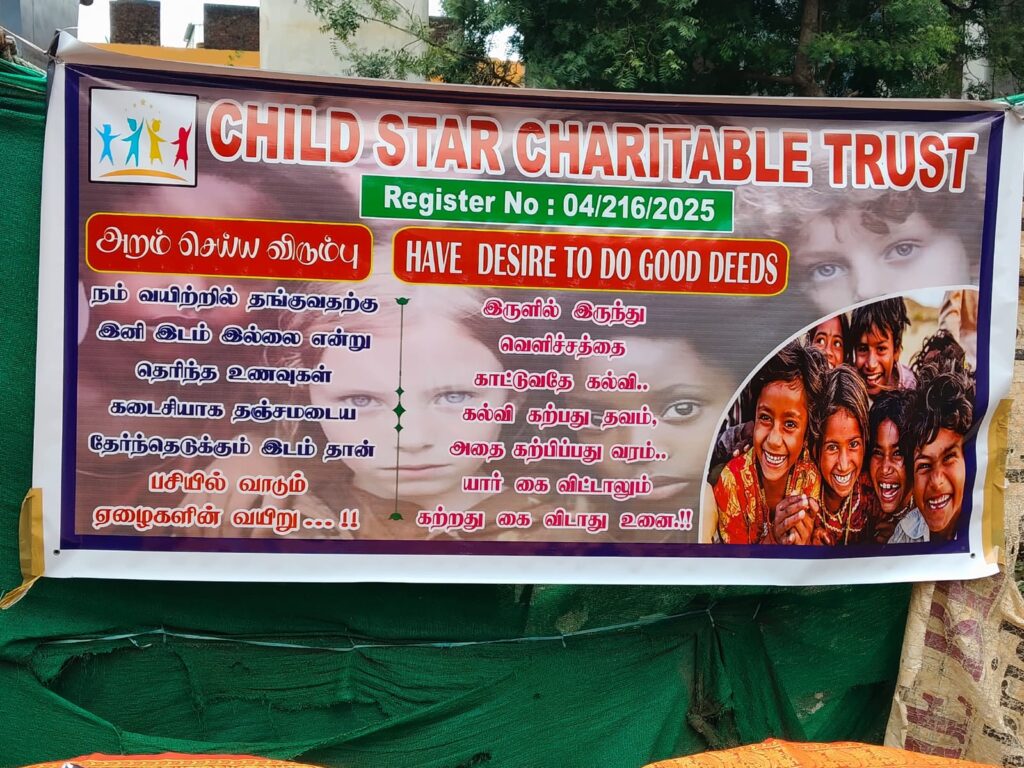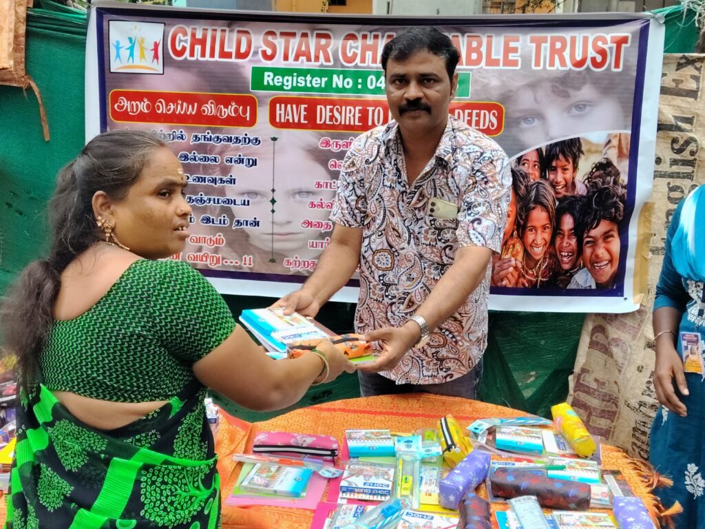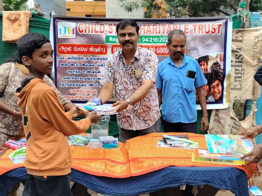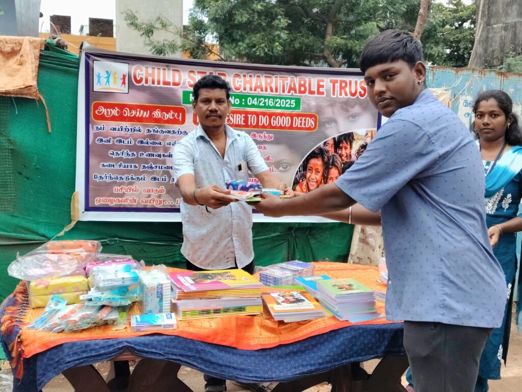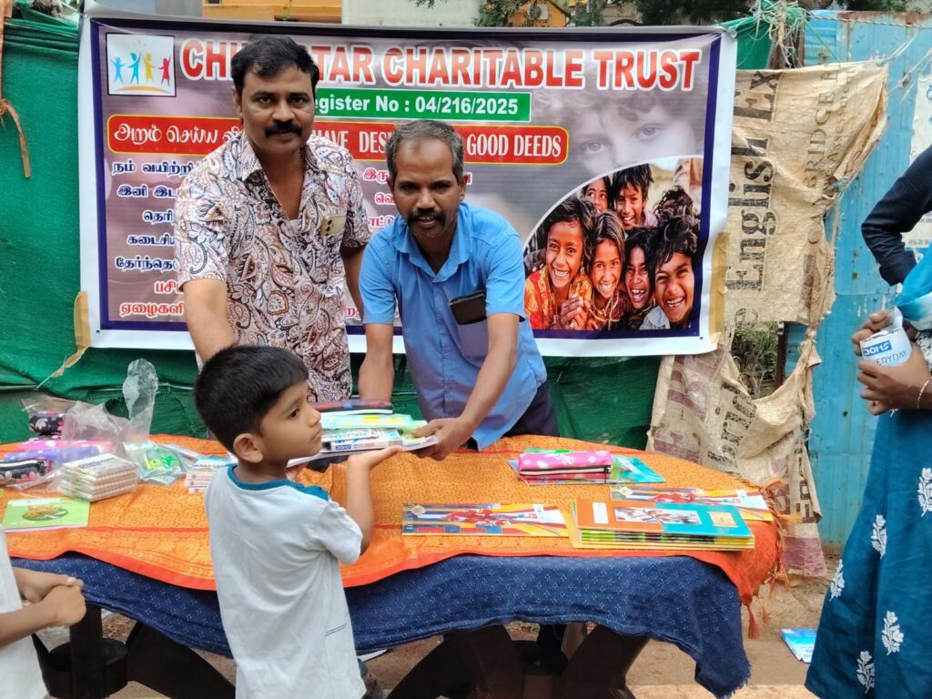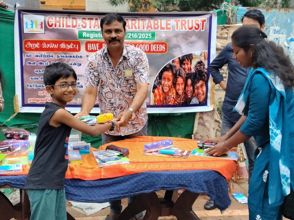 On November 23, 2025, Child Star Charitable Trust organized a street outreach event in Chennai, distributing essential stationery kits (books, notebooks, pens, and school supplies) to 100 underprivileged children and families.